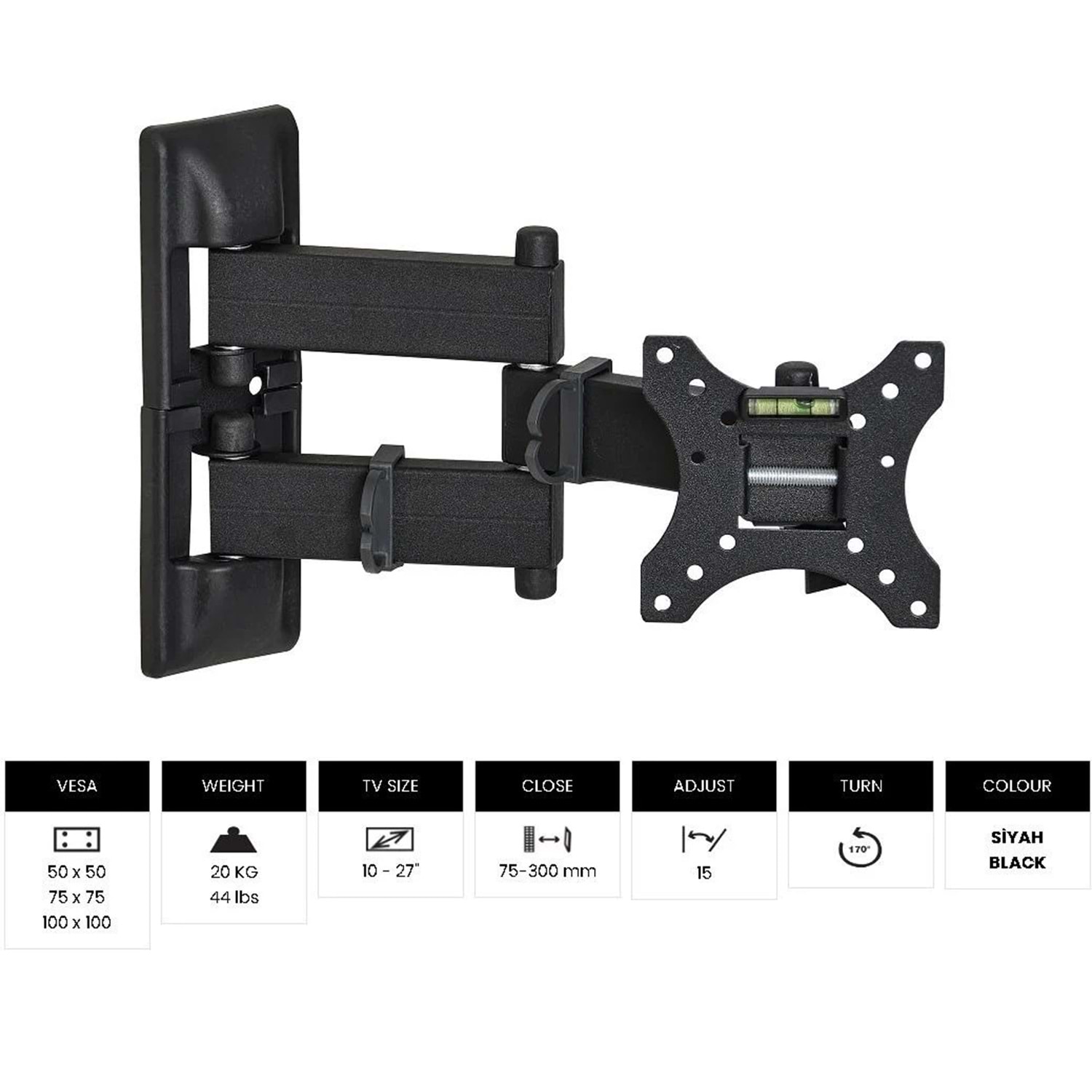 VESA VT-222 HC pro hareketli tv askı aparat ıVESA 50 x 50 75 x 75 100 x 100 ağırlık kapasitesi VT-222 HC pro hareketli tv askı aparatı ağırlık kapasitesi 20 KG 44 lbs televizyon boyutu VT-222 HC pro hareketli tv askı aparatı televizyon boyutu 10 - 27" ileri-geri mesafe VT-222 HC pro hareketli tv askı aparatı ileri-geri mesafe 75-300 mm eğim açısı VT-222 HC pro hareketli tv askı aparatı eğim açısı 15° dönme açısı VT-222 HC pro hareketli tv askı aparatı dönme açısı